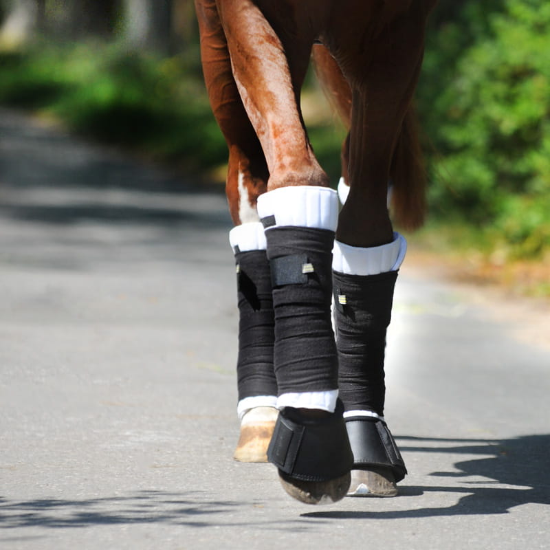Komfortowe podkładki z miękkiego polaru stanowią idealną ochronę przed nadmiernym uciskiem bandaża. Wykonane z miękkiej tkaniny polarowej z bawełnianym wypełnieniem, są "oddychające" i szybkoschnące. Pikowane wzdłużnie dzięki czemu łatwo przylegają do nogi konia. Zapięcia na rzep zapobiegają przesuwaniu się podkładki i przytrzymują je w odpowiednim ułożeniu.